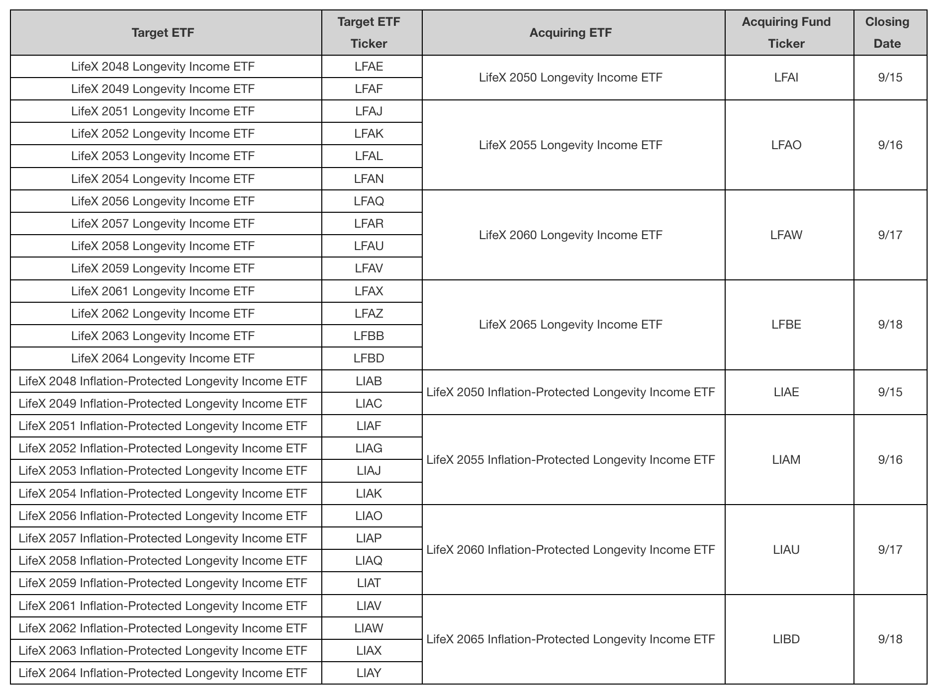 - 14 of the Longevity Income ETFs will be reorganized with and into the 2050, 2055, 2060 and 2065 Longevity Income ETFs as described further below (each, a “Fixed Reorganization”).